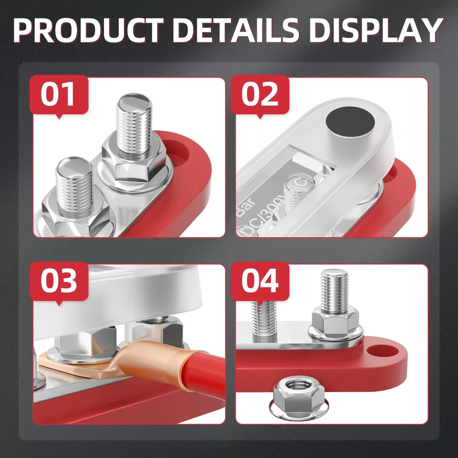 Distribution propre & sûre : 5 bornes à goujons M6 (1/4") pour regrouper et répartir vos retours + / − en 12 V / 24 V / 48 V CC.