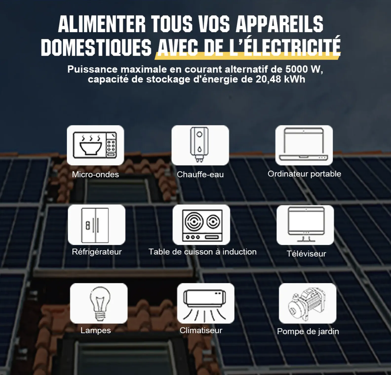 Avec 12 panneaux solaires monocristallins full black de 430 Wc, un onduleur tout-en-un 5000 W avec MPPT 80 A et une banque de batteries lithium rack 20,48 kWh, ce kit est conçu pour une utilisation intensive, quotidienne ou en secours en cas de coupure réseau.