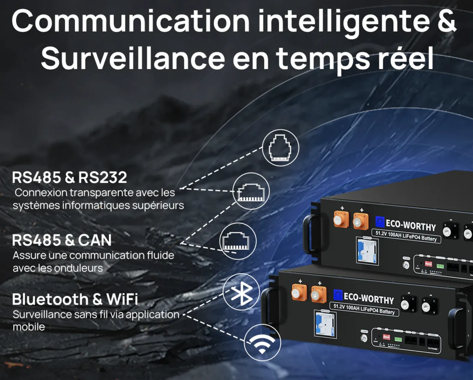 - Surveillance intelligente des batteries via interfaces CAN/RS485 et application (Bluetooth / Wi-Fi).