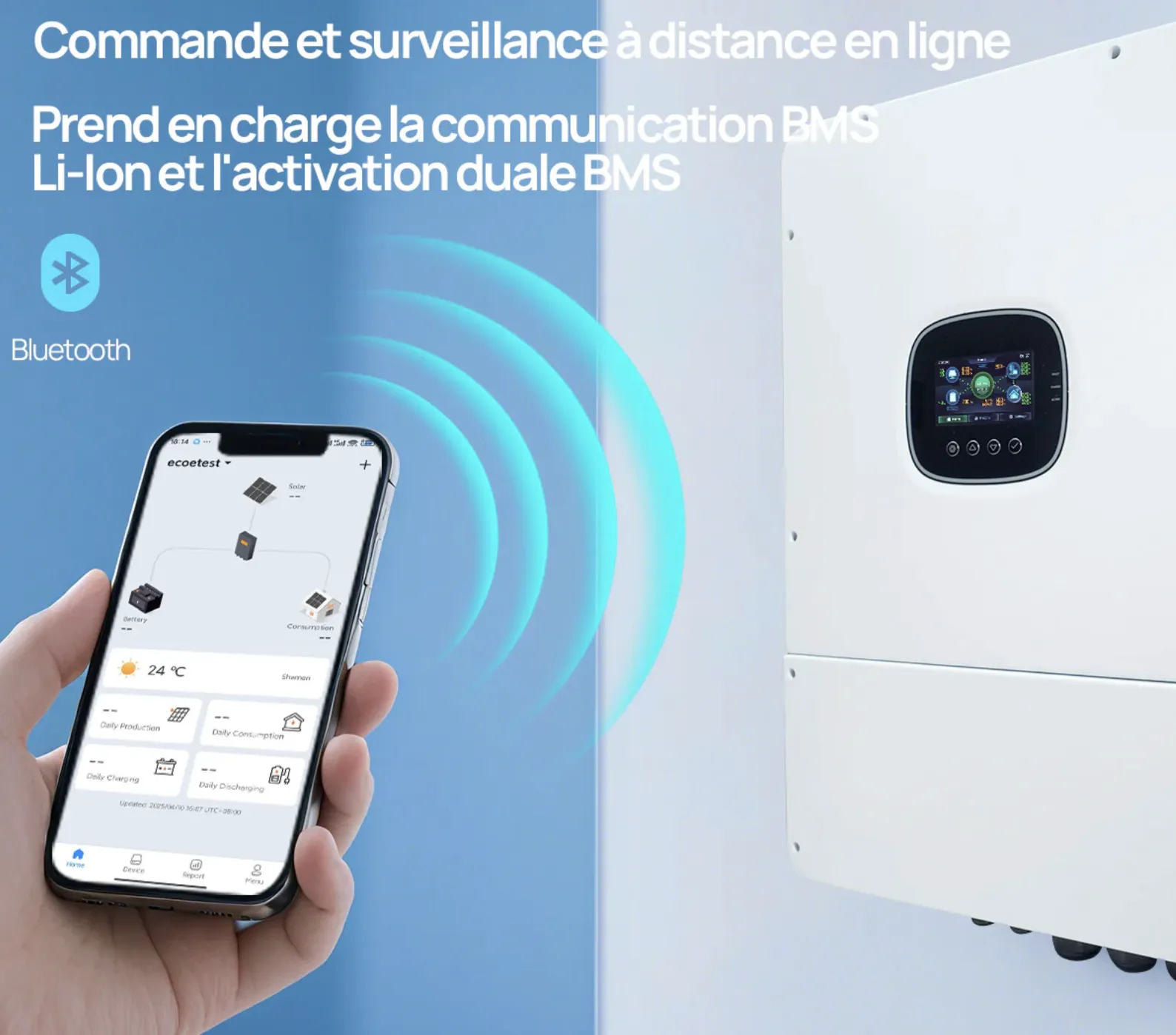 - Fonction : onduleur hybride tout-en-un (solaire + réseau + batteries)